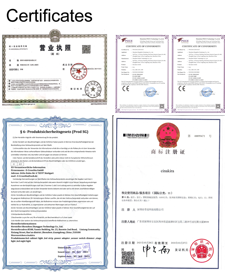 Shenzhen Zhanggan Technology Co. Ltd является профессиональным поставщиком светильников для шкафов в Шэньчжэне, Китай. Наша бренд - Cinakira. Мы специализируемся на разработке, производстве, продаже и послепродажном обслуживании светильников для шкафов, включая светильники-диски на светодиодах, светодиодные ленты для шкафов, светодиодные подсветки полок, светодиодные подсветки под шкафами, светодиодные светильники для гардеробных шкафов, сенсорные выключатели, блок питания и т.д. Наши продукты продаются в более чем 50 странах. Мы придерживаемся принципа "Качество на первом месте, Удовлетворительное сотрудничество, Честная торговля" и стараемся максимально удовлетворить клиентов разумной ценой, качественными продуктами и лучшим обслуживанием.