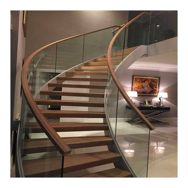 Накладной стеклянный ступенчатый современный внутренний лестничный марш с криволинейной/дуговой стальной балкой-подпоркой
