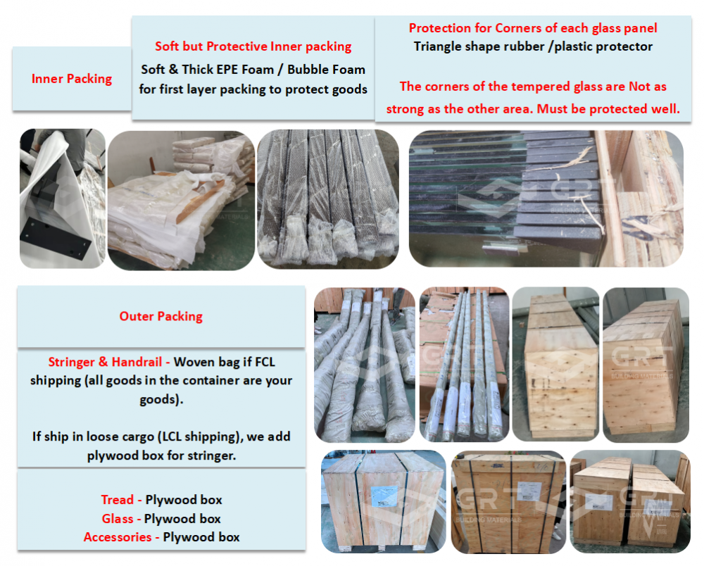 Стрингер и поручень: Пенопласт + тканый мешок (добавить фанеру в деревянный ящик, если грузится в неполную контейнерную партию);
