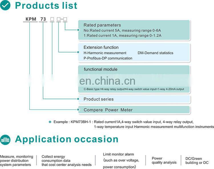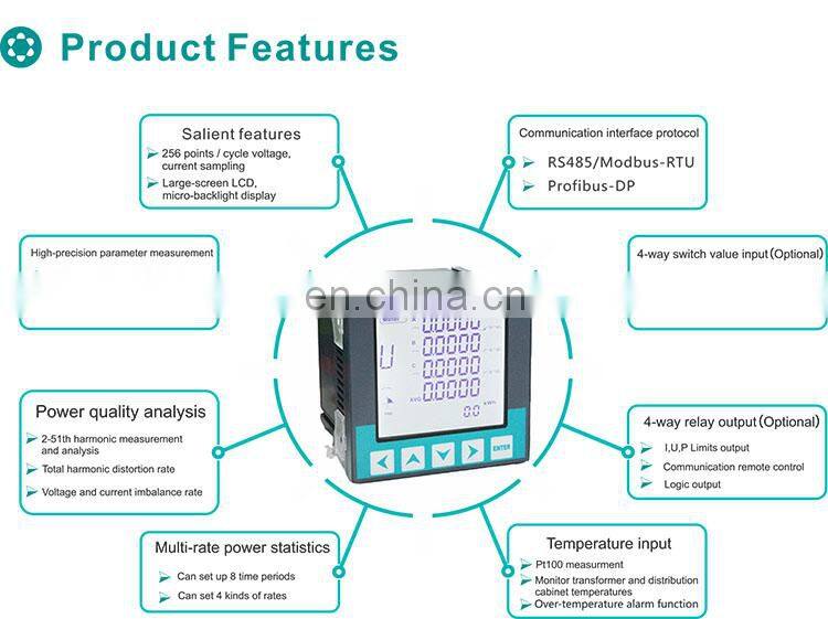 Использует современный процессор ARM и технологии цифровой обработки сигналов, цифровой счетчик мощности. Собирает комплексные трехфазные электрические параметры измерения/дисплея, накопление энергии, анализ качества электрической энергии, многотарифную статистику, цифровой ввод/вывод и сеть связи в одном устройстве. Имеет высококачественный технологический процесс изготовления, хорошее электрическое изоляцию и электромагнитную совместимость, большой экран ЖК-дисплея и другие преимущества.
