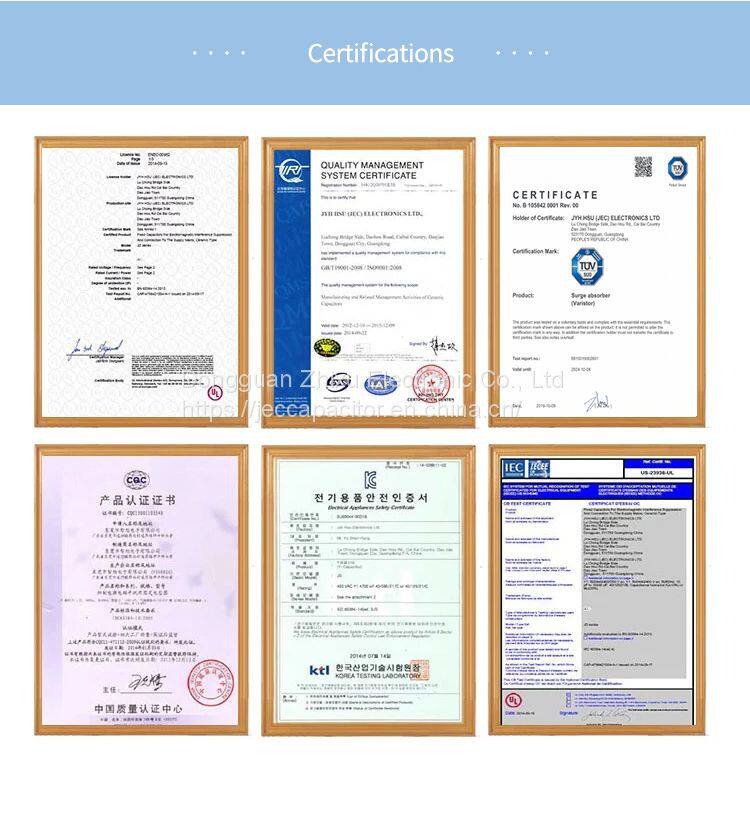 Фабрики Dongguan Zhixu Electronic Co., Ltd. (также JYH HSU(JEC)) сертифицированы по стандартам ISO-9000 и ISO-14000. Конденсаторы X2, Y1, Y2 и варисторы JEC прошли следующие сертификации: