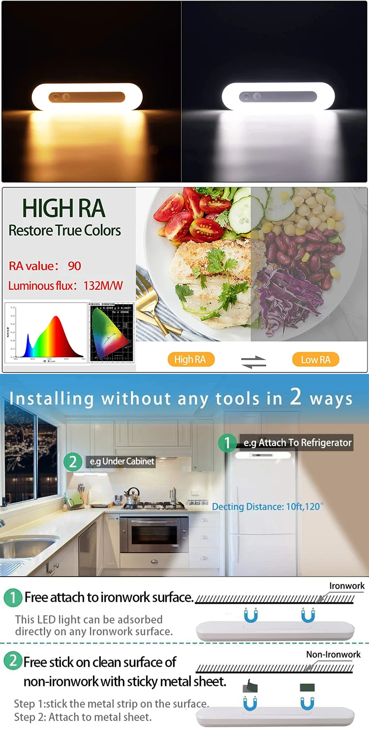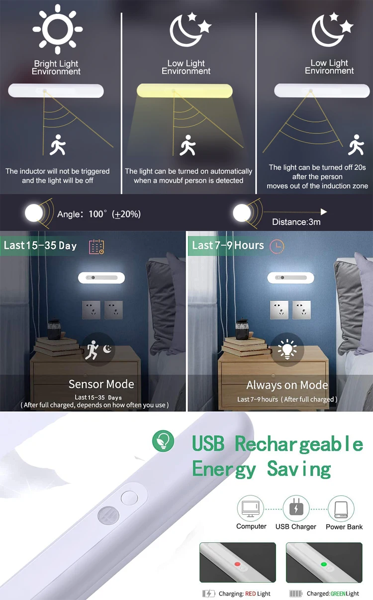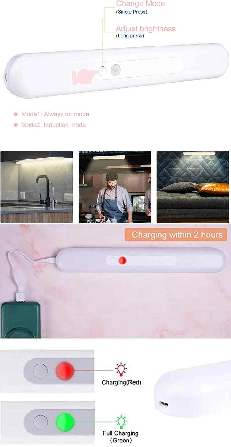 О това изделиеКомфортное освещение- Светильник для шкафов на светодиодах выполнен из высококачественного материала ABS и имеет матовую обработку. Свет становится рассеянным, блокируется вредное воздействие синиго света на глаза, глаза чувствуют себя более комфортно при неизменной яркости. Кроме того, яркость этого светильника для шкафов на светодиодах можно регулировать по потребности.Высокая емкость- Подстольное освещение оснащено литий-ионной батареей емкостью 1200 мАч, одна зарядка обеспечивает работу от 60 до 90 дней или непрерывную работу в течение 8 часов.Сильная адсорбция- Подстольные светильники отличаются от способа крепления с использованием двусторонней скотч-пленки, распространенного на рынке. У них на нижней стороне два магнита, благодаря чему они могут быть прикреплены к металлической поверхности без дополнительной помощи.3 режима цикла- Датчик света имеет 3 режима. РЕЖИМ 1: Режим датчика движения: Один клик на кнопку. Свет мигает 3 секунды, затем гаснет, чтобы включить режим индукции (Свет горит 25 секунд после того, как человек уходит). РЕЖИМ 2: Режим постоянного включения (один клик на кнопку). РЕЖИМ 3: Выключен. 3 режима и регулировка яркости позволяют нашему светодиодному подсветному прибору для шкафов удовлетворить все повседневные потребности.