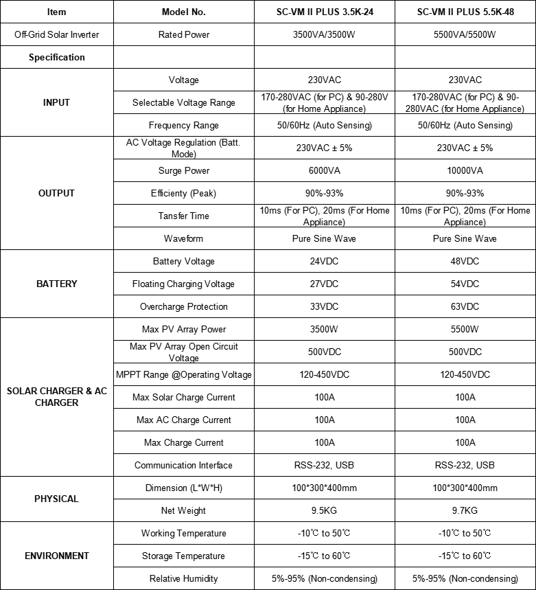 | Модельный номер | SC-VM II PLUS 5.5K-48 | Тип | Преобразователи постоянного тока в переменный | |