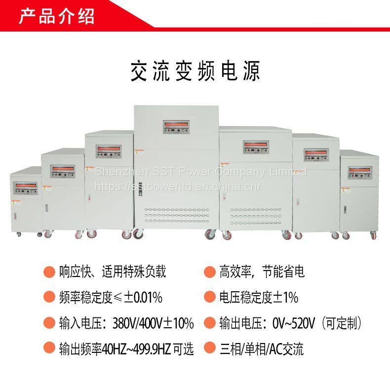 Источники переменного тока обычно предназначены для тестирования промышленного оборудования, авиационного оборудования, бытовых приборов и т. д., применяемые в технической области. Частота также может быть настроена на 400 герц для приложений, таких как тестирование военного/авиономического оборудования или для работы 400-герцовой электроники, установленной на борту самолета или военного судна.