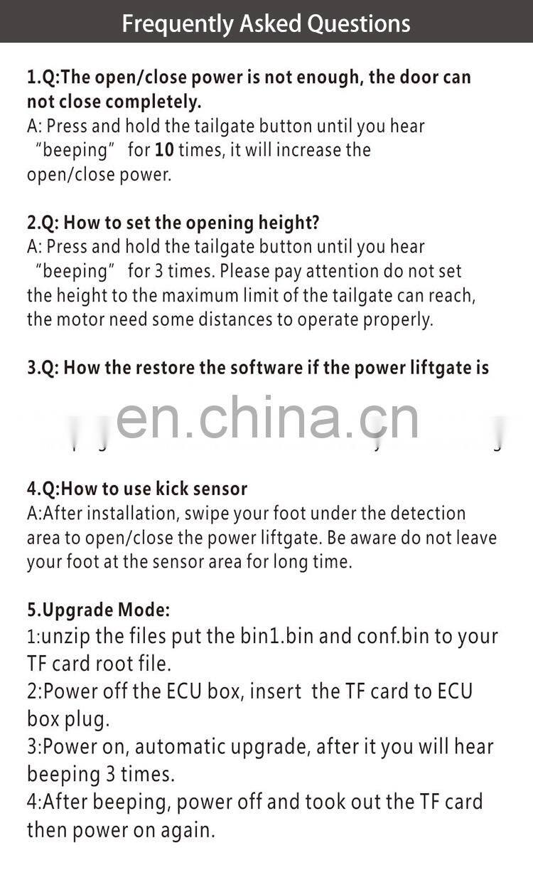 2. В: Поддерживаете ли вы услугу по предоставлению образцов? А: Да, мы можем предоставить образец для тестирования, включая руководство по установке и техническую поддержку после того, как клиент приобрел образец. 3. В: Какие условия доставки системы электрического подъемника задней двери автомобиля? A: EXW, FOB, CFR, CIF, DDU.