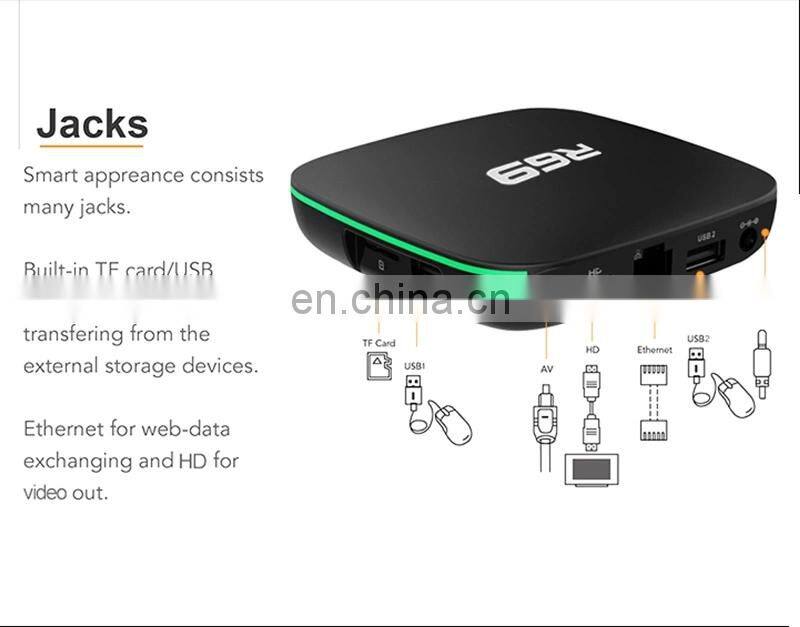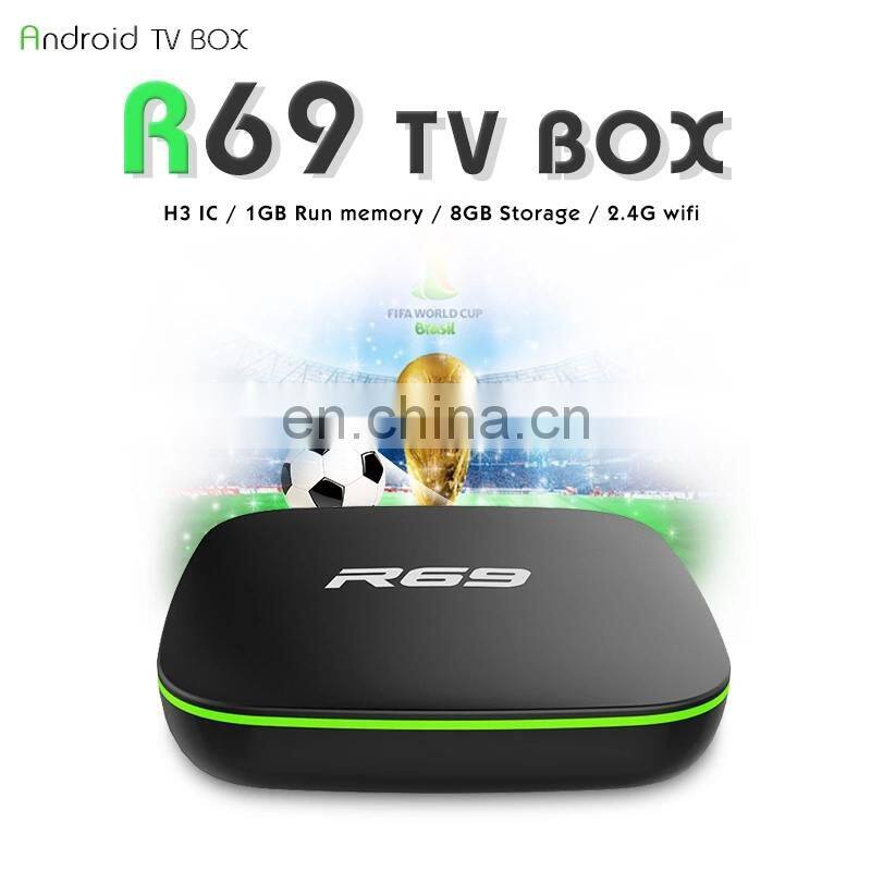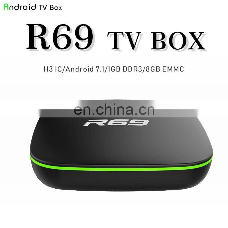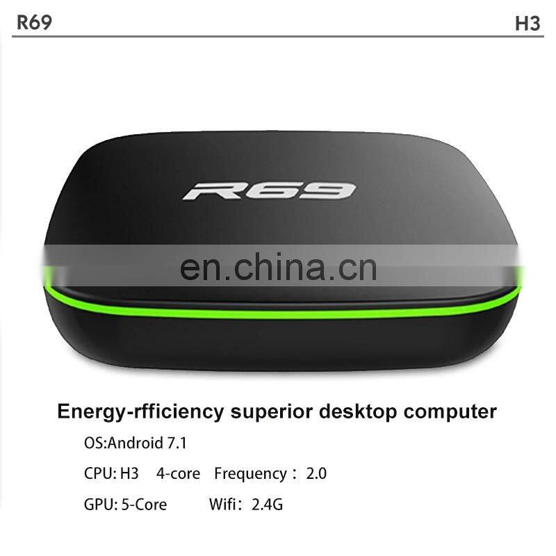 Главная > Продукты > Allwinner android TV-приставка > Самый дешевый мини-приемник Android TV Box R69 на базе Allwinner H3 с 2 гБ ОЗУ и 16 гБ ПЗУ, Android 7.1, умный телевизионный бокс 4K R69