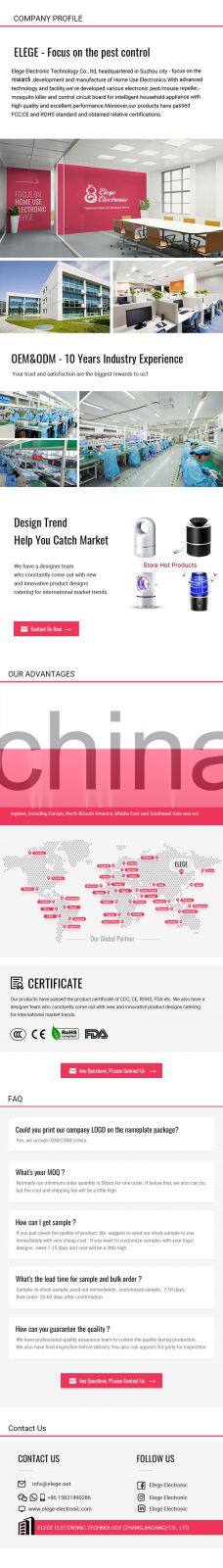 Elege Electronic Technology (Zhangjiagang) Co., Ltd специализируется на разработке и производстве увлажнителей и диффузоров. Мы можем проводить исследование и разработку продуктов, проектирование форм, производство, литье под давлением, SMT-монтаж и сборку. Целевые рынки - ремесленные изделия, домашние товары. Мы разрабатываем, производим и продаем увлажнители, диффузоры и мелкие бытовые электронные приборы. Наша миссия - 'держать непрерывный прогресс, стремиться к совершенству, быть честными, иметь инновации как душу. Захватывать рынок высококачественными продуктами, быть продуктивными за счет переднего менеджмента. Создавать превосходную предприятие благодаря нашим усилиям'. Мы получили отличные отзывы от наших партнеров и клиентов.