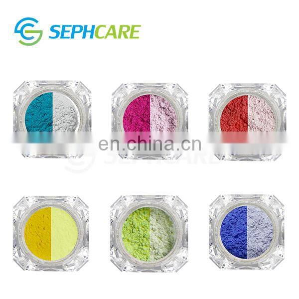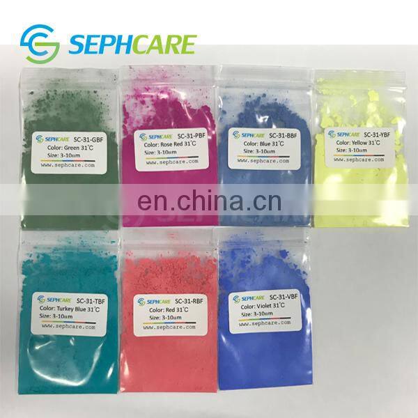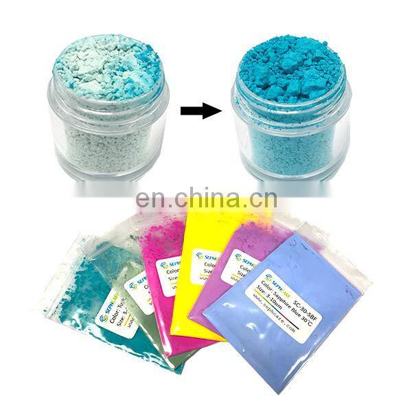 Термохромный пигмент меняет цвет в зависимости от температуры. По мере повышения температуры пигмент становится бесцветным или приобретает цвет, раскрывая подложку или рисунки под ним или цвет пигмента. Термохромный пигмент Sephcare в основном используется в косметике, для окрашивания волос и т.д.