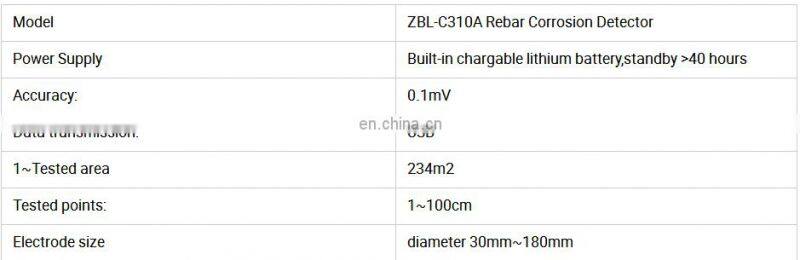 ZBL-C310A - это специализированное устройство; оно разработано в соответствии с электрохимическим методом тестирования (методом естественного потенциала) ?Технического стандарта строительных испытаний?. Используя теорию электродной поляризации, C310A измеряет потенциал поверхностей бетона с помощью эталонного электрода Cu/CuSO4 и определяет уровень коррозии арматуры с помощью широко используемого метода естественного потенциала.