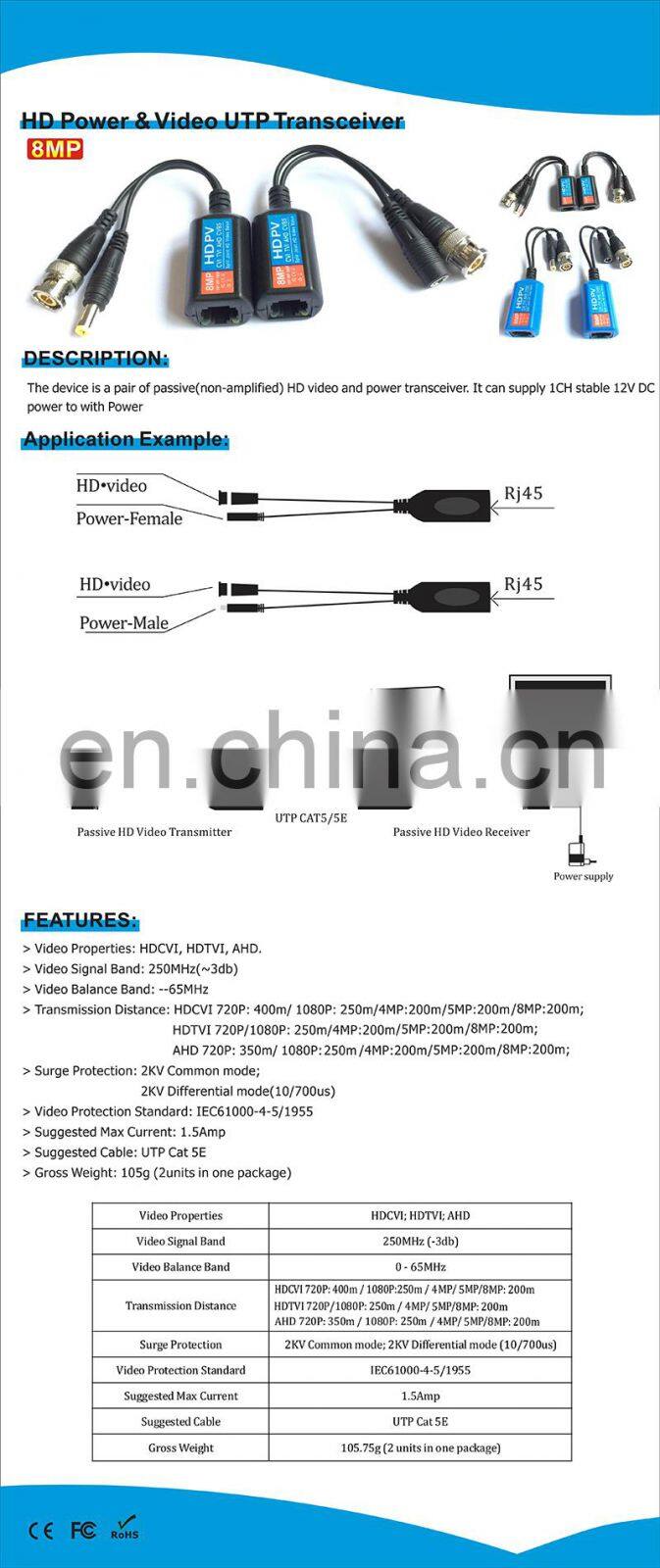 Пассивный 8MP HD UTP-трансивер для передачи питания и видео, видеобалун для HDCVI, HDTVI, AHD