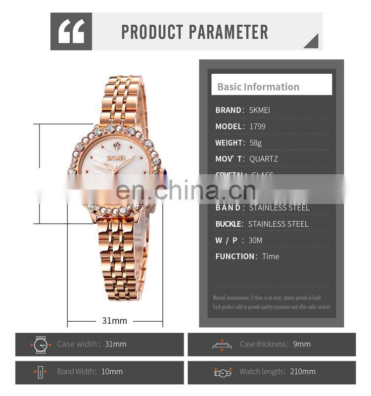Главная > Продукты > Кварцевые часы > Лучшие брендовые часы фабрики SKMEI 1799 с браслетом из нержавеющей стали, японским механизмом, батареей SR626SW, женские часы с роскошным дизайном