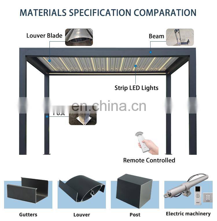 Главная > Продукты > Алюминиевая пергола > Алюминиевые моторные водонепроницаемые навесы для перголы, солнцезащитные ламельные крыши беседки с электрической алюминиевой перголой с ламелями