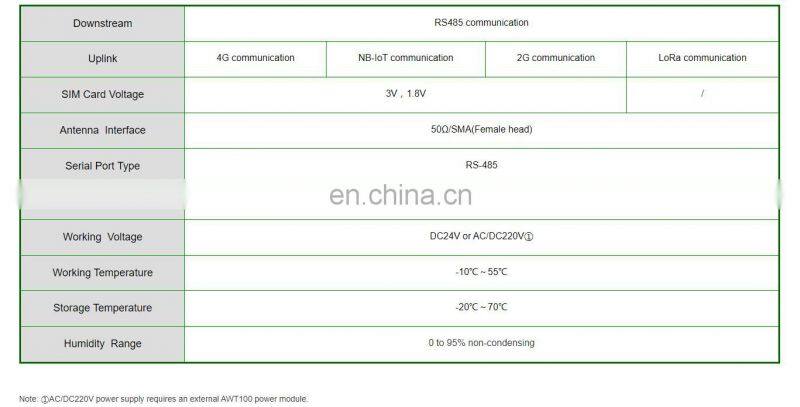 Главная > Продукты > Удаленный терминал (Remote Terminal Unit) > умный шлюз беспроводного коммуникационного терминала AWT100-4GHW 4G 485 коммуникационный интерфейс