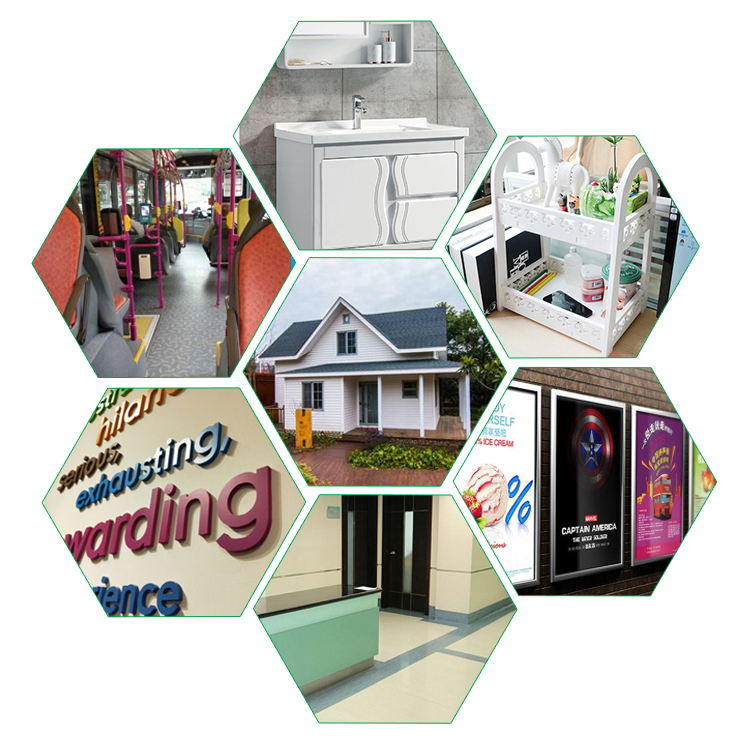 Толщина варьируется от 1 мм до 35 мм. Пластины имеют гладкую поверхность и могут использоваться для профессиональной печати. Поэтому они широко применяются в рекламной индустрии. Обработанные по формуле устойчивости к воздействию погоды, они не склонны к старению и сохраняют цвет длительное время. Это хороший заменитель дерева и может использоваться для обработки продукции, таких как распиловка, штамповка, перфорация, сверление, ввинчивание винтов, клепание гвоздей. Он водонепроницаем и обладает высокой коррозионной стойкостью. Это хороший материал для изготовления кухонных и ванных шкафов, книжных полок, декоративных стен и широко используется в индустрии внутренней отделки.