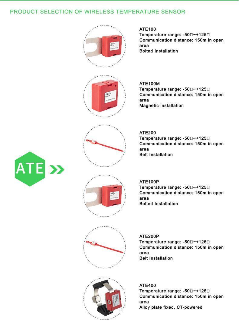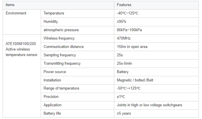 Беспроводной датчик температуры ATE200 разработан в соответствии с Спецификацией для беспроводных измерительных устройств температуры NB/T 42086-2016. Он подходит для 3-35 кВ внутренних распределительных шкафов, включая встроенные распределительные шкафы, распределительные шкафы на тележках, неподвижные распределительные шкафы и кольцевые распределительные шкафы. Также он подходит для 0,4 кВ низковольтных распределительных шкафов, таких как неподвижные распределительные шкафы и распределительные шкафы с выдвижными ящиками.