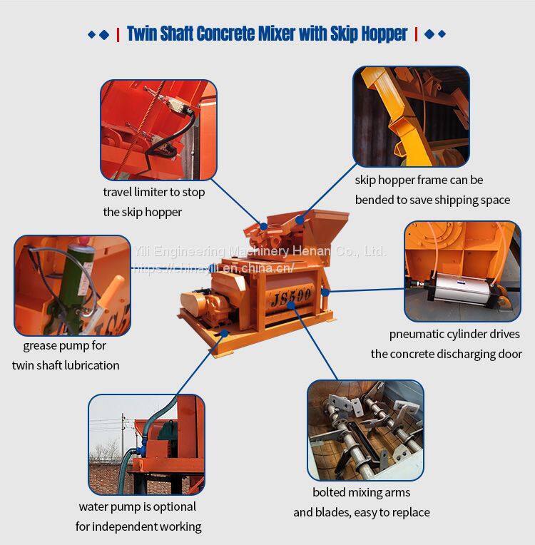Серия JS компании Yili двухвальный бетономешалка очень популярна для бетонно-засыпных заводов. Она обеспечивает очень хороший эффект смешивания готового бетона благодаря принудительному смешиванию. Два вала также обеспечивают высокую эффективность смешивания, что позволяет экономить время.