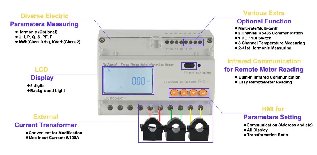 ADL3000-E Трехфазный многофункциональный счетчик электроэнергии на шину DIN Номинальный ток 3x10(80)А 3x1(6)А ЖК-дисплей умный счетчик электроэнергии