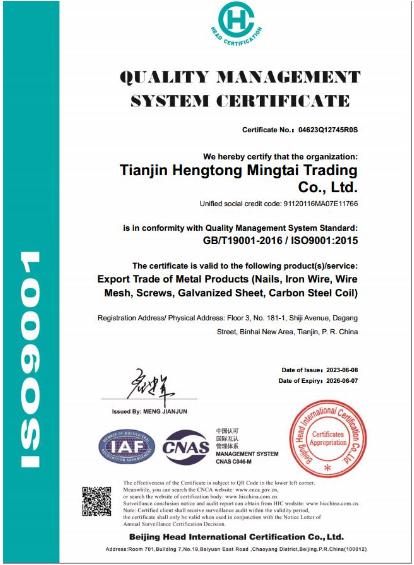 Мы являемся производственным предприятием, которое производит и продает различные строительные, декоративные гвозди и проволочные изделия. У нас есть собственные заводы по волочению проволоки и производство гвоздей. С увеличением спроса на экспортные товары мы зарегистрировали и создали Tianjin Hengtong Mingtai Trading Co., Ltd. Для осуществления самостоятельного экспорта продукции. Мы получили право самостоятельного ведения внешнеэкономической деятельности и стали промышленно-торговым предприятием.