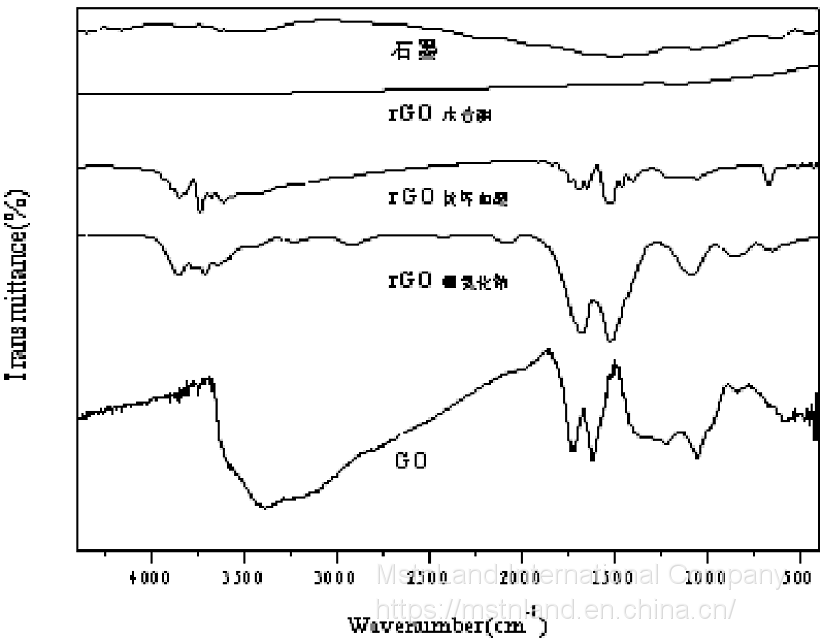 Инфракрасный спектрограмма графита, окиси графена (GO) и восстановленного окиси графена (rGO)