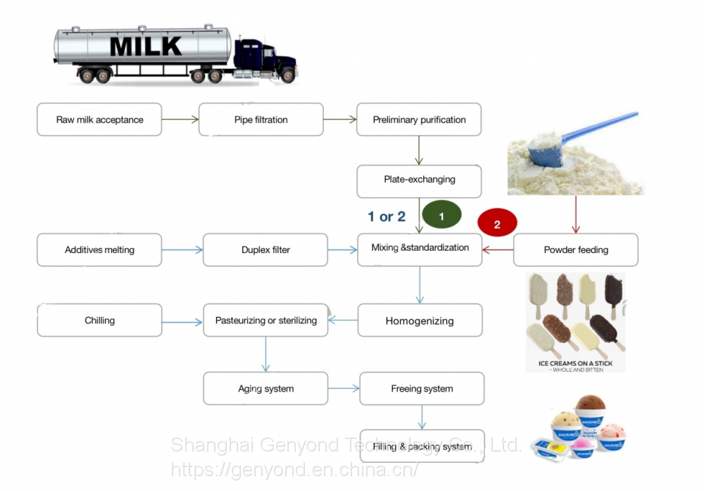 Смесь для мороженого проходит через фильтр в балансовый бак и оттуда подается насосом в пластинчатый теплообменник