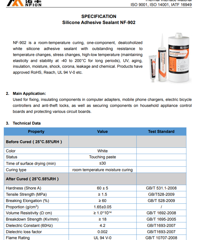 NF-902 - это однокомпонентная белая силоконовая герметизирующая клеймастика, отверждающаяся при комнатной температуре, с удалением спирта, обладающая отличной устойчивостью к изменениям температуры, изменениям напряжений, высоким и низким температурам (долговременно сохраняет эластичность и стабильность в диапазоне от -40 до 200°C), воздействию УФ-излучения, старению, обладает изоляционными, влагозащитными, ударопрочными, короностойкими, герметизирующими свойствами и устойчивостью к химическим веществам. Продукты соответствуют стандартам RoHS, Reach, UL 94 V-0 и др.