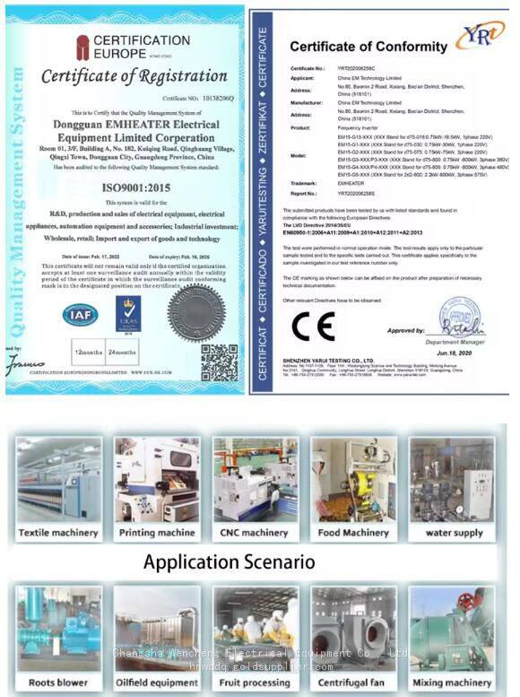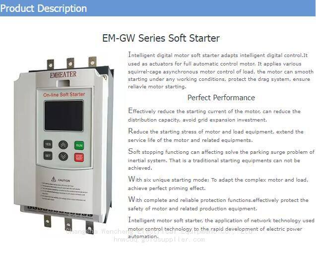 EMHEATER усилиенно работает в области привода и управления! EMHEATER неизменно поддерживает конкурентоспособные цены для своих клиентов! EMHEATER стремится развиваться вместе с партнерами! У нас есть 6 фабрик и более 820 сотрудников. Как профессиональный производитель промышленных автоматизированных продуктов, мы всегда занимаемся разработкой мягких пусковых устройств, частотных преобразователей, серводвигателей и приводов, фильтров электромагнитных помех, гармонических дросселей переменного тока, синусоидальных фильтров, тормозных блоков и резисторов. В 2008 году группа компаний EMHEATER создала "China EM Technology Limited" для освоения зарубежных рынков. У нас есть следующие серийные продукты: 1.EM15 серия частотных преобразователей векторного управления. (220В~690В:0.75 КВт~630 КВт). 2.EM15-SP серия частотных преобразователей для солнечных насосов. (220В~690В:0.75 КВт~630 КВт). 3.EM-GJ/GS серия мягких пусковых устройств, (220В/380В~480/690В:5.5 КВт~ 600 КВт). 4.EM-GW серия онлайн-мягких пусковых устройств, напряжение 380В до 525В, мощность от 11 КВт до 600 КВт. Прямой пуск асинхронного двигателя. ЖК-дисплей. 5.EM-GB серия мягких пусковых устройств с встроенным байпасом на напряжение 380В, мощность от 5.5 КВт до 400 КВт. Прямой пуск асинхронного двигателя. ЖК-дисплей. 6.EM-GS серия мягких пусковых устройств на напряжение 220В до 690В, мощность от 5.5 КВт до 650 КВт. ЖК-дисплей. 7.EM-HS серия высоковольтных мягких пусковых устройств на напряжение 6 КВ до 10 КВ, мощность от 220 КВт до 11500 КВт. 8.EMA до EMD серии систем управления серводвигателями, (220~380В;0.2~22 КВт). И соответствующие аксессуары (фильтры, дроссели, резисторы).