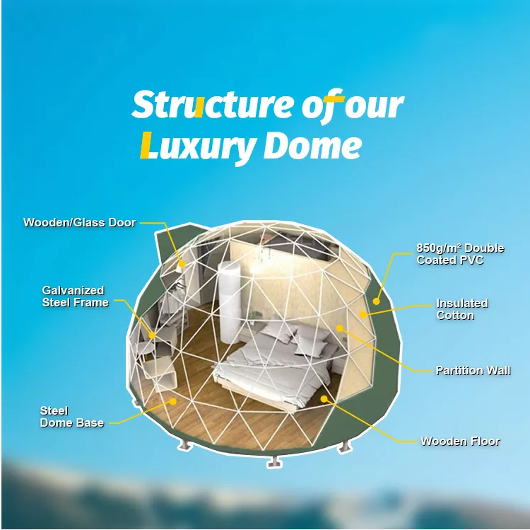 Главная > Продукты > Купольный палатка > Водонепроницаемая роскошная палатка для глумпинга в форме геодезической купола длиной 6 м