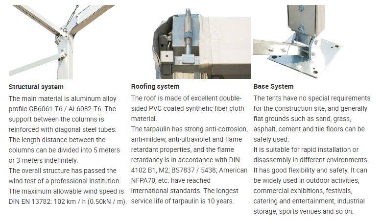 Huapin Construction Technology (Guangdong) Co., Ltd. Специализируется на проектировании конструкций наружных алюминиевых сплавных шатров, управлении качеством, глобальных продажах. Клиенты довольны нашими большими свадебными шатрами, шатрами для вечеринок, шатрами для наружных мероприятий, выставочных шатрами, спортивными шатрами, шатрами для логистического хранения, шатрами для приемов, шатрами для спортивных мероприятий, временными шатрами для совещаний и т.д. Они имеют широкое применение и удовлетворяют потребности большинства групп клиентов. Продукция экспортируется в более чем 150 стран и регионов и одобрена и высоко оценена клиентами. Наша философия бизнеса: мы придерживаемся высокого качества и сервиса, сопровождаем клиентов на всем пути, удовлетворение клиентов - это наш вечный стремящийся цель. Шатра Huapin постоянно развиваются и помогают клиентам выбирать предварительно собранные алюминиевые сплавные конструкционные шатра, соответствующие рыночным стандартам, и делают каждый деталь с превосходной технологией. В то же время у нас есть многолетний опыт в импорте и экспорте шатров и профессиональные технические специалисты, которые могут предложить решения.