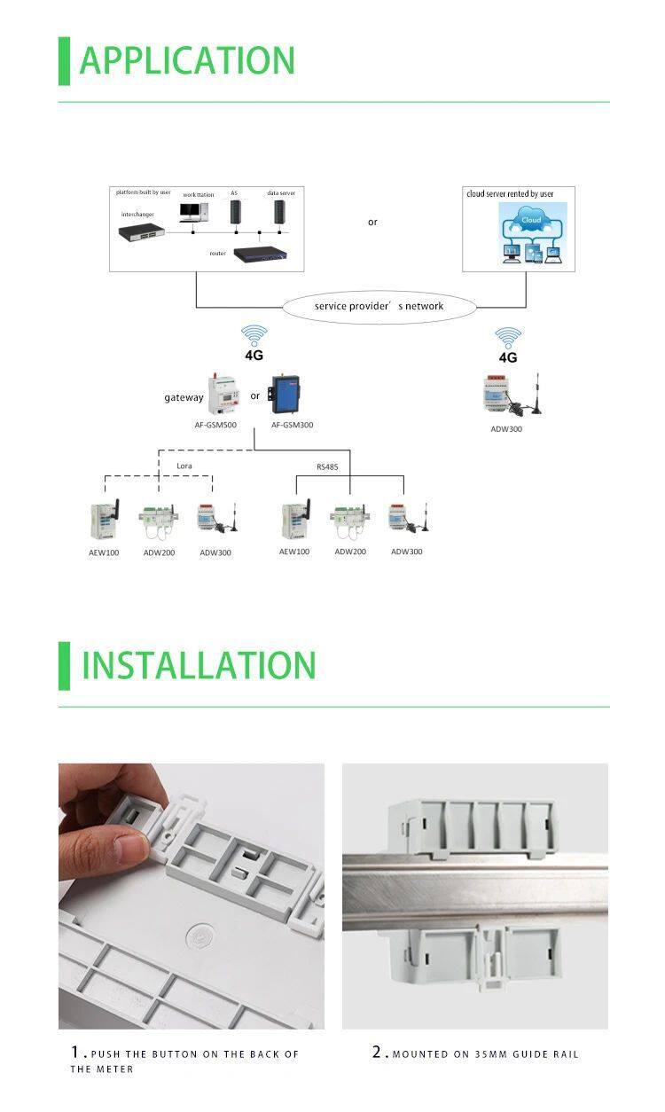 Счетчик ADW300 беспроводной предназначен главным образом для измерения трехфазной активной мощности в низковольтной сети. Он имеет функции RS485 коммуникации и 470 МГц беспроводной связи. Это удобно для пользователей для контроля, сбора и управления электроэнергией. Он может быть гибко установлен в распределительную панель, чтобы реализовать измерение, статистику и анализ индивидуальной электроэнергии в разных регионах и нагрузках.