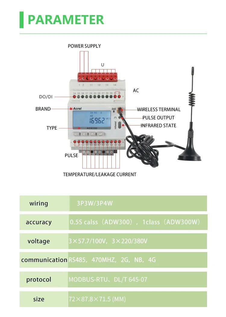 - Acrel ADW300 Дин-рейльный интеллектуальный электросчётчик для контроля, сбора и управления электроэнергией