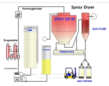 Молочный порошок - это порошковый продукт, полученный из свежего молока в качестве сырья с добавлением определенного количества растительного белка, жира, витаминов, минералов и других сырьевых материалов. Процесс производства включает стерилизацию, концентрирование и сушку. Молочный порошок сохраняет оригинальное качество и питательную ценность молока. Он имеет низкую влажность, небольшой размер, легкий вес, длительный срок хранения, удобен в употреблении и легко переносится. Линия по переработке молочного порошка включает систему приема сырого молока, танк для стандартизации сырого молока, предварительный нагреватель сырого молока, гомогенизатор, стерилизатор, сепаратор для отделения жира (для производства обезжиренного молочного порошка), вакуумный концентратор сырого молока, установку для приготовления сахара (для производства сладкого цельномолочного порошка), распылительную сушилку, сито для просеивания молочного порошка, охладитель, заполнитель, контрольную установку, упаковочное оборудование, станцию для очистки CIP, котел, градирню, компрессор, холодильник, соединительные трубы, клапаны, изгибы, насосы и т.д.