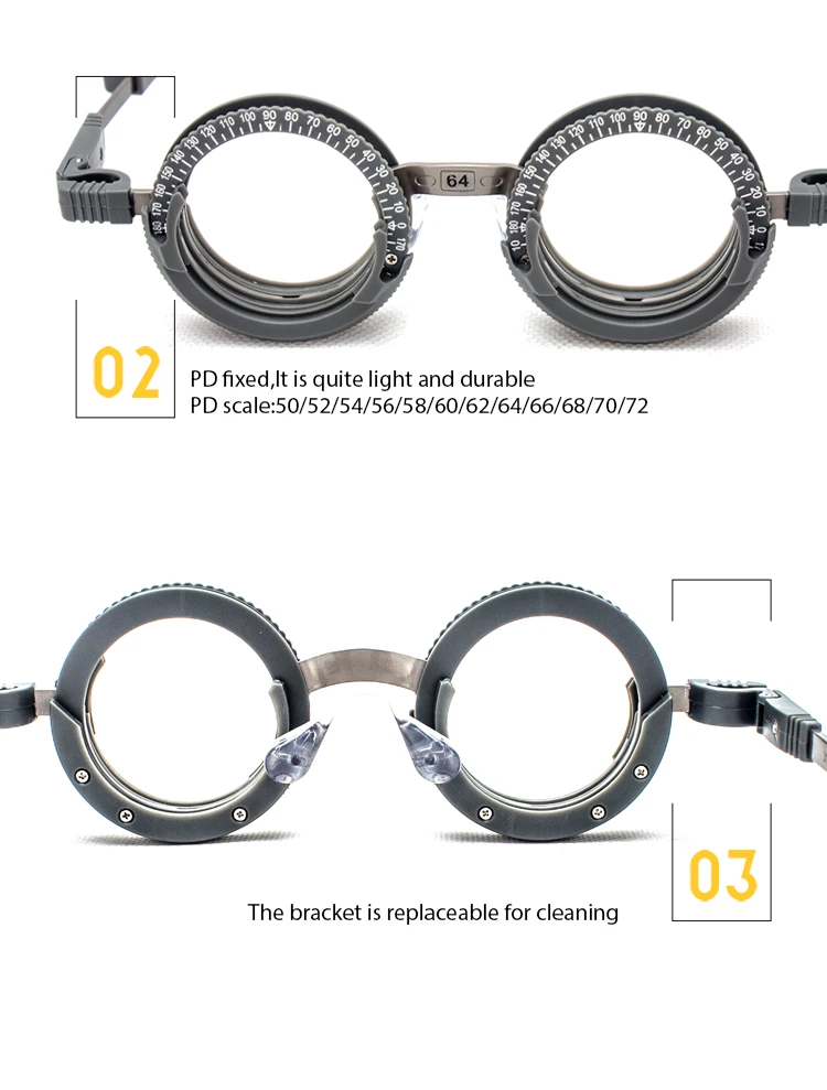 В комплект входит: 1xТестовый рама 1. Диапазон межзрачкового расстояния: 50; 52; 54; 56; 58; 60; 62; 64; 66; 68; 70 мм. Обратите внимание на цвет при заказе. 2. Шкала оси: 360° слева; 360° справа. Шкала оси увеличивается против часовой стрелки вдоль оси рамы, интервал разметки - 5°. 3. Эффективное внутреннее отверстие рамы: Φ38 мм. 4. Количество линз, которые можно вставить в левую и правую рамы: 3. 5. Степень вращения оптической оси линзы во внутреннем кольце рамы: 360 °. 6. Неравнолелие между оптической осью линзы и геометрической осью рамы: ≤2.5 7. Разница между оптическим центром и геометрическим центром линзы: ≤0.5 мм. 8. Смещение линзы относительно геометрического центра рамы: ≤0.3 мм. 9. Диапазон регулировки длины левой и правой ножки рамы: 125~155 мм.
